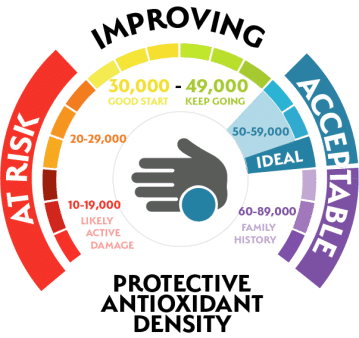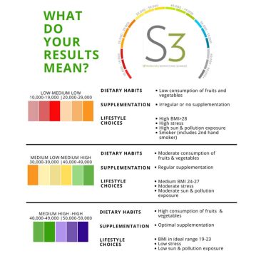 Azáltal, hogy méri a karotinoid antioxidánsok stabil szintjét a bőrében, és létrehozza a bőr karotinoid pontszámát, a szkenner pontosabb és megbízhatóbb biomarkert biztosít az általános antioxidáns egészségi állapotáról, mint más antioxidáns mérési módszerek. A bőr karotinoid pontszámának megszerzése tudatára ébred a szervezete antioxidáns szintjének, és megadja a szükséges lökést az általános antioxidáns egészségének javításához.