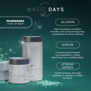 Készen állsz rá, hogy fiatalnak érezd magad? Hogy átéld a harmonikus szellemi és testi működés kiváltotta szabadságot? Ezzel nem vagy egyedül. Az este bevett R² Night segít felfrissült közérzettel kezdened a mindennapokat. A reggelente bevett R² Day a feltöltődésben és egy új nap kihívásainak legyőzésében segít. Frissülj és töltődj fel az R²-tel! Az R² Day pompás összetevő-keverékkel kecsegtet, melyben helyet kapott a Cordyceps Sinensis, gránátalma és a Panax ginseng. A ginzeng három, a korral jellemzően hanyatló vitalitásdimenziót támogat: fokozza a fizikai teljesítőképességet, valamint segít a mentális funkciók és az egészséges szexuális vágy megőrzésében. Az R² Nightban lévő szelén hozzájárul a sejtek oxidatív stresszel szembeni védelméhez. Nettó tömeg– R² Night: 22 g – R² Day: 109 g